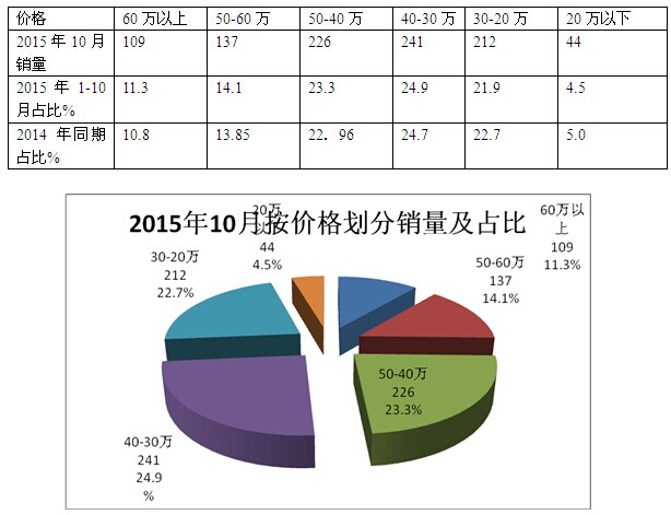 三、按价格划分对2015年10月LNG天然气客车销量结构分析-销量主要集中在20-50万之间,60万以上和20万以下的销量相对较少
