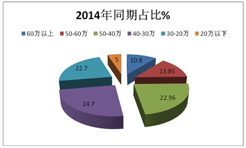 2、价格在40-30万的销量最大,占据的比例达到24.7%,但比2014年同期提高了0.2个百分点,根据市场调研,这一价格区间对应的产品主要是10-11米或者9-10米长度段的LNG客车。一般用来做公交车使用。因为此两区段的公交车相对来说性价比较高,既能够有较大的载客容量,空载率相对又比较低,因此比11-12米和特大型公交回报率要好一些,因此,这一区段的LNG客车的产品销售较好也符合公交市场的规律。