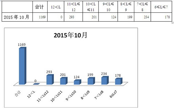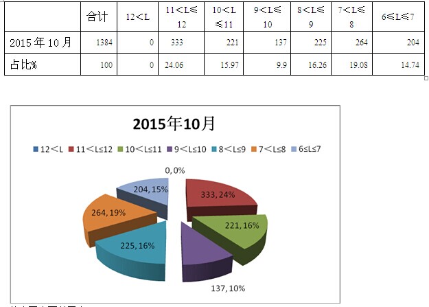 1、各长度段中,2015年10月比值最大的是10-11米段,说明这段公交占据的优势地位最强,反之,6-7米段比值相核最小,这段市场中,公交占据的地位相对较弱。