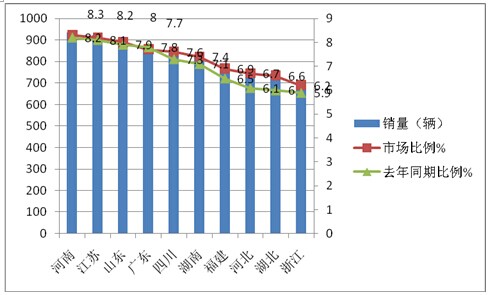 2、7-8米公路客车市场流向分布不均衡,河南、广东、江苏等经济强省的市场份额均超过8%,但同比去年均相应有所上升,强者愈强。