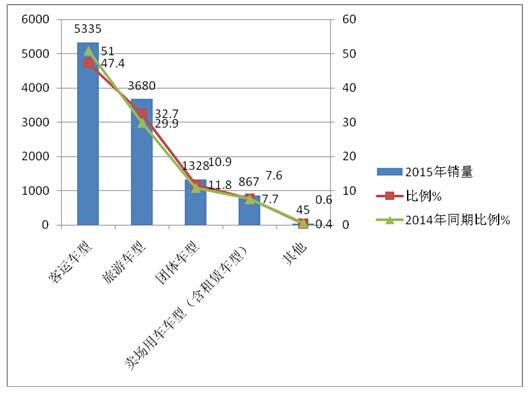 2、 2015年前10月客运车型同比比例在下降,下降幅度达到3.6个百分点;旅游客车在上升,团体客车、卖场租赁客车的比例也均在上升,其上升幅度分别为2.8%、0.9%、0.1%,说明7-8米公路客车的客运车型市场份额受到了高铁、火车等交通工具的挤压,而旅游客车由于空载率相对大车较低而受到市场欢迎,团体客车、卖场租赁车型的市场2015年受到市场环境的影响也相对好转,这给7-8米公路客车的生产制造商们一个明确的启示。