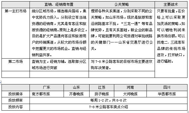 可以把广东、山东、江苏、河南、四川、湖南等确立为7-8米公路客车的第一主打市场,把湖北、福建、河北、浙江、辽宁等作为第二市场,对不同市场采取不同的策略。采取直销为主、经销为辅的方针。直销可以采取人海战术,多派驻业务人员,直接寻找目标客户,经销可以在重点区域市场寻找经销商,利用当地的资源和渠道来拓展市场。