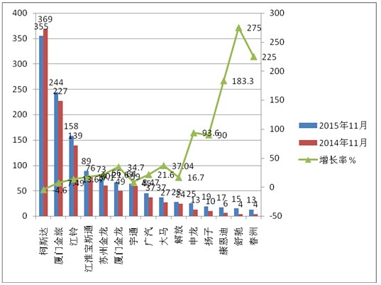 一、2015年11月考斯特客车销售数据分析—同比增幅达到14.6%,除川考下降外,其余均呈现增长