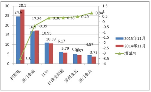 2015年11月份小金龙考斯特车型单月销售244台,同比增长7.49%,是国产考斯特品牌中销量最大的企业