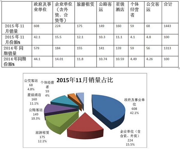 按照目标市场用途划分,2015年11月各细分市场的销量及市场份额如下表: