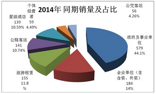 2.企业单位:外资、合资、大型国企、民营企业等用于接待、员工福利用车,占市场15.5%(同比上升1.4个百分点)。