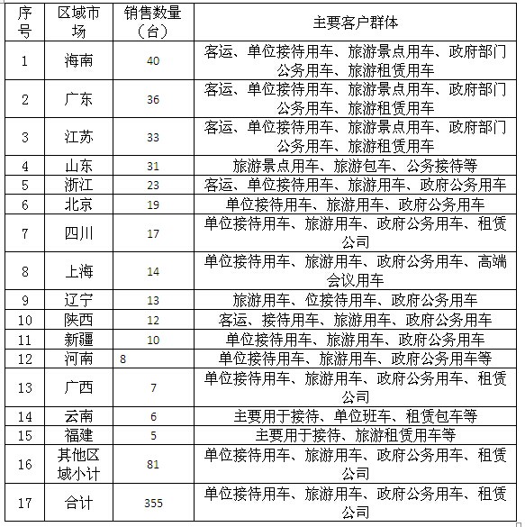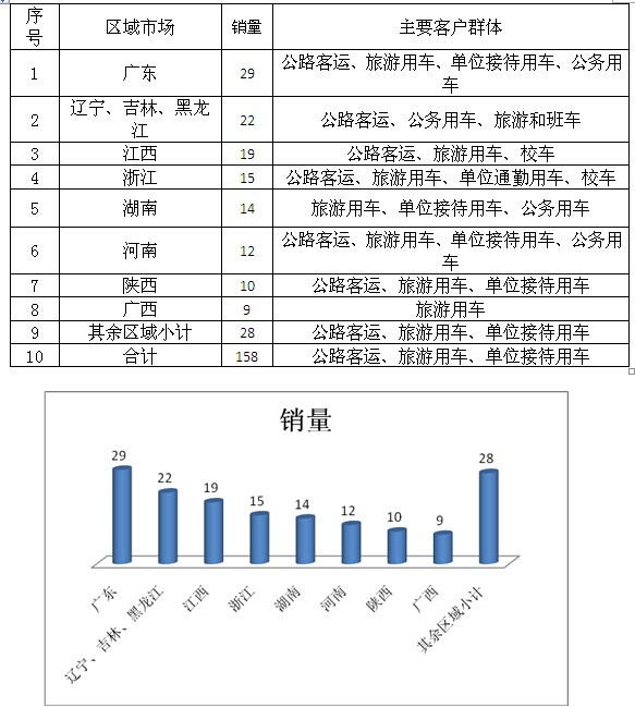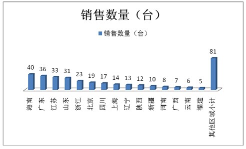 从上图表可知,广东、福建、江苏、山东即海南是小金龙考斯特客车销量最大的前5个区域市场。