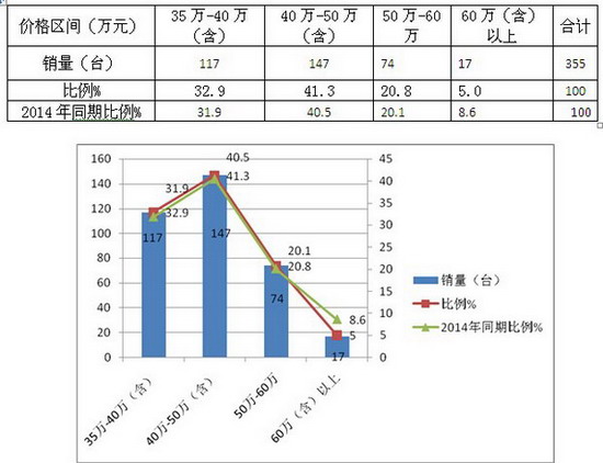从上分析可以看出:丰田柯斯达价格在40-50万之间的产品销量比例最大,且同比有上升趋势,其次是30-40万的价格区间,同比也有上升态势,60万以上的高档销售比例最小,但同比有下降态势,而50-60万区间的产品销量比例与2014年同期相比也有微弱上升迹象,也就是说,除了60万以上高端区间是下降的以外,其余价格区间的销量权重均有不同程度的上升。