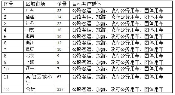 从上表看出:丰田考斯特2015年11月份的重点销售区域是海南、广东、江苏、山东、浙江、北京、四川、上海、辽宁、陕西、新疆等区域市场,海南居于第一,不愧为全国国际旅游岛。同时也说明了上述区域市场是高端考斯特客车需求的重点区域市场,这给国内生产制造考斯特的客车企业在市场营销策略制定和重点资源投放上提供了一定的启示。