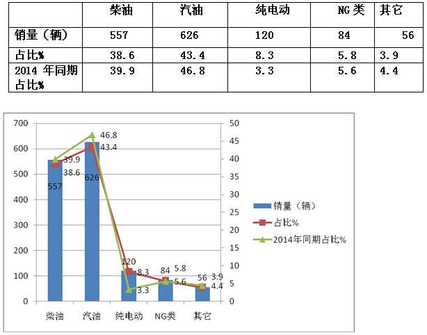 根据最新上牌数据信息,2015年11月份累计销售1443辆考斯特客车,按动力种类划分统计如下表: