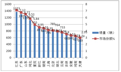 上图表显示,2015年11月前15名新能源客车销售区域共计销售新能源客车13333辆,占据总销量的69.14%,其中江苏区域市场份额最大,其次是广东区域,再次是山东区域。可见,重点区域的市场集中度较高,其余15个区域将近30.6%的市场份额。