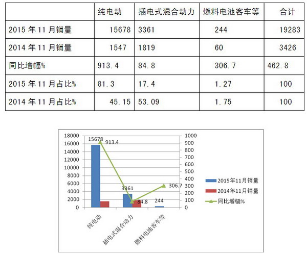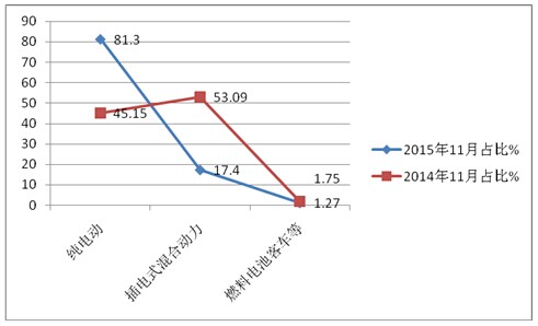 2、插电式混合动力客车2015年11月份占比相对2014年同期降低了近36个百分点。