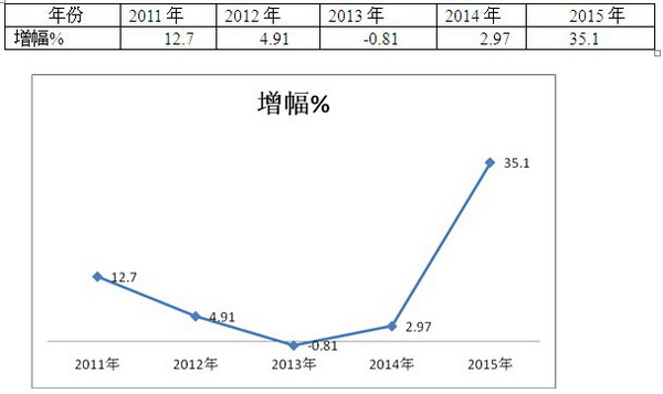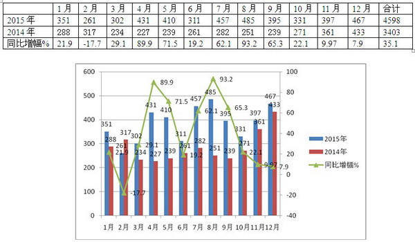 一、2015年各月销量增幅(2月除外)均为正值,8月销量、增幅均为最大 ,全年增幅超过35%,为近5年来最大