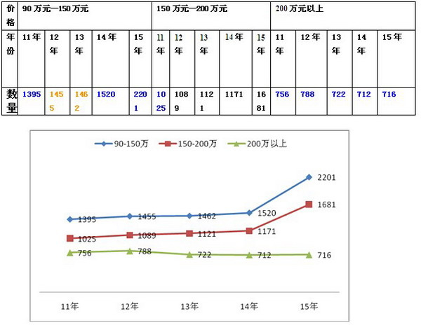 通过上表3,我们可以看出:通过价格来细分高档客车市场,我们把豪华客车的价格分成三个区间90—150万,150—200万,200万以上,这样分析起来就比较方便和清楚一些。