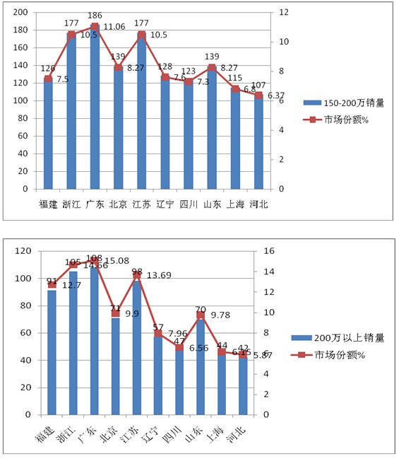 1、福建、浙江、广东、北京、江苏等10个区域市场是90万以上高档客车市场需求的主要市场,集中度比较高。需求比例占整个高档客车市场的81.73%(2014年同期为80.75%),比2014年同期提高了近1个百分点;其他区域市场销售高端客车只有近18.27%的市场机会。在90-150万的价格区间,集中度为73.06%(2014年同期为72.88%),同比提高了0.18个百分点;150-200万的价格区间的集中度为84.3%(2014年同期为86.83%),同比降低了2.53%);200万以上的集中最高度为96.79%(2014年同期为87.5%),同比提高了9.29%,也就是说,90万以上高档客车在200万以上区间集中度最高,90-150万集中度最低,即随着价格的升高,集中度也在升高,集中度与价格成正比。