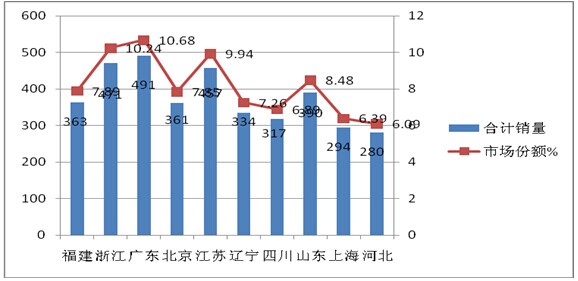 5、山东是高端客车市场需求量第四大的区域市场,整体集中度为8.48%.具体为:对价格在90-150万区段的需求的集中度是8.22%,对价格在150-200万的区段的需求的集中度为8.27%,对价格在200万以上的区段的需求的集中度是9.78%,.也就是说,在山东区域市场,价格在90-150万集中度次小, 150-200万区间的产品市场集中度最小,200万以上最大,但市场份额仍然不小,因此,高端客车生产企业对山东区域的营销策略也不容忽视,因为该区域对高端客车市场需求的机会也不小,主要因为山东是沿海发达的区域之一, 青岛、威海、烟台等旅游市场也很发达,无疑拉动了对高端客车市场的需求.