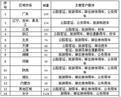 (三)江铃考斯特:江铃考斯特2015年1-12月销量为1128台,比2014年同期的1029辆增长9.6%,主要销售区域在广东、东北、江西、浙江、天津等区域市场,目标客户群体主要是旅游客运和公路客运。