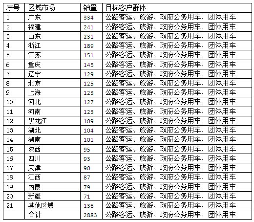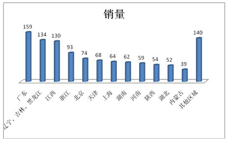 从上图表看出:丰田考斯特的重点销售区域是广东、江苏、北京、山东、浙江、四川、上海、辽宁、河南、陕西、新疆等区域市场。同时也说明了上述区域市场是高端考斯特客车需求的重点区域市场,这给国内生产制造考斯特的客车企业在市场营销策略制定和重点资源投放上提供了一定的启示。