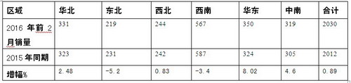 从上图表可知:2016年前2月,全国各大区域CNG客车销量中,西南区域销量最多,但同比呈现下降态势;其次是华东区域,且同比增幅最大;再次是华北区域;同比增幅次大的是中南区域市场,再次是东北区域市场,其余区域同比出现负增长。
