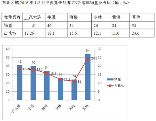 上牌数据显示,2016年1~2月辽宁、吉林、黑龙江等区域市场共计销售CNG客车219辆,同比下降5.2%,吉林省销售最多,达到104辆;从车型看,大中型客车为主流,中型客车销量85辆,占据38.8%的权重.有12个品牌的CNG客车在东北区域发生销售,前五家企业依次是一汽大连、宇通客车、苏州金龙、河南少林、黄海,其余企业销量都不多。一汽大连客车厂由于有地域优势,前2个月销售41辆,占据近18.26%的市场份额,其次是宇通客车占据18.1%的市场比例,再次是海格客车占据15.6%的市场比例,第四是少林客车占据12.1%的市场比例,第五是东北本地企业黄海客车占据11.0%的市场比例。