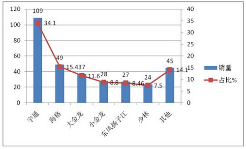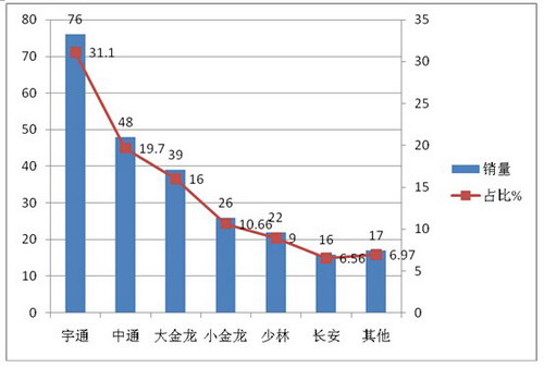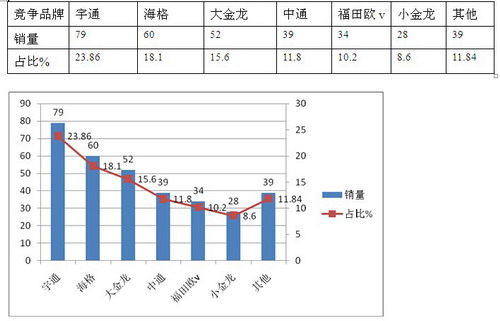6、中南区域(含河南、广东、湖南、湖北、海南、广西等市场)---广东市场销量最大,大型客车权重为最大,宇通客车市场占有率最高,参与竞争的品牌最多,是全国六大区域市场竞争最充分的市场