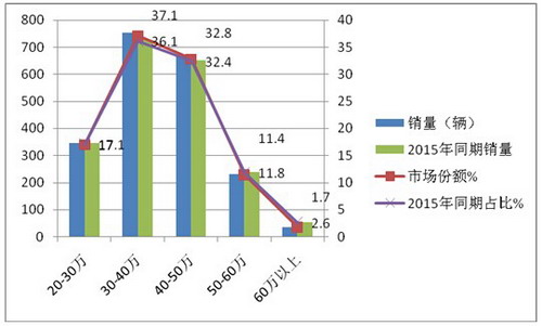 1、2016年1-2月,30-40万的价格区间的CNG客车销量最大,其次是40-50万的价格区间,这两个区间是CNG客车销量最大的主力区段,几乎各占据总体销量的三分之一。其余区间销量较少,从价格和销量分布关系看,销量分布出现了“两头小,中间大”的市场迹象。