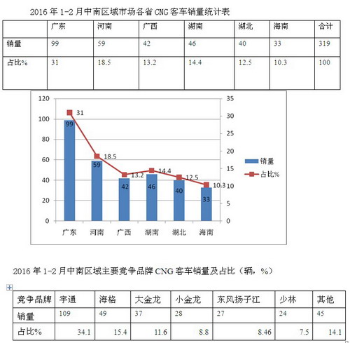 2016年1-2月湖北、湖南、河南、广东、广西、海南中南区域等区域共计销售CNG客车319辆,比2015年同期的305辆增长4.6%,广东省销售最多,达到99辆;从车型看,大型客车为主流,销售116辆,占据的权重为38.0%,共有20家企业的CNG客车在中南区域发生销售,是全国六大区域中参与竞争企业最多的区域市场,竞争最分散,最充分。其中宇通品牌占据首位,销量为101辆,占据33.1%的市场份额;海格客车居第二,大小金龙分别居于第三、第四,东风杨子江居于第五,少林位于第六。
