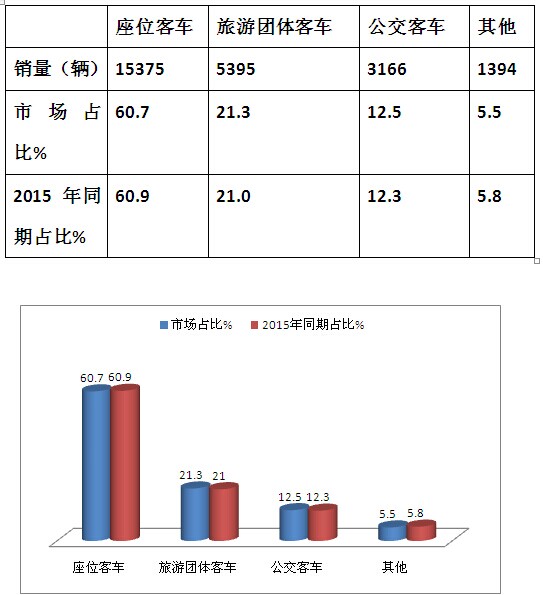 从上图表可知,2016年2月份,在销售的25330辆客车中,座位客车依然占据了最大的市场比例,达到60.7%,但同比下降了0.2个百分点。其次是旅游团体客车,占据的比达到21.3%,同比提高了0.3个百分点,再次是公交客车,占比为12.5%,同比提高了0.2个百分点。