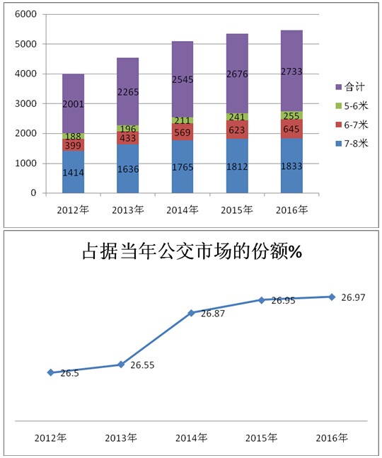 3、近5来城乡公交市场销量占据当年公交总体市场的份额也在逐年攀升,从2012年的1-2月的26.4升到2016年 1-2月的26.97%