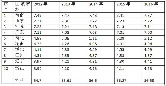 1、2016年前2月河南、山东、江苏、广东、河北、湖南、湖北、四川、辽宁、浙江等销量前10名的主流区域市场城乡公交的市场占有率超过了全国城乡公交总市场的半壁江山(达到56.58%),高于2012年、2013和2015年,但低于最高的2014年同期。与2014年同期比,2016前2月城乡公交车的区域垄断程度在微小减弱,其他非重点区域市场的市场机会在加大,从另外一方面也说明,中国农村经济发展的地区差异在逐步缩小。