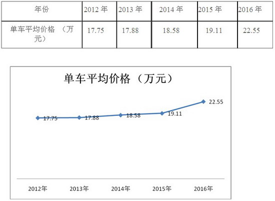 由上图表看出:近5年1-2月7~8米公交车单台平均销售价格逐年在上升, 2014年单价也上升了近0.7万元。也是因为2013年年7月1日后排放普遍提升到国IV的缘故,2015年比2014年单价提高了0.53万元(可能是由于随着国家对纯电动客车补贴政策的扩大,有部分7-8米纯电动客车加入了城乡公交队伍),城乡公交车的档次随着时间的推移也在逐步提高,同时也反映了目标消费者随着生活水平的提高对城乡公交车的档次和舒适性等要求也越来越高了,2016年1-2月同比2015价格提高了3.44万元,幅度之大是近5年同期最高的,经过市场调研,主要是因为7米多的考斯特纯电动客车车型及7-8米纯电动中巴车型加入了一些区域的城乡公交队伍,而且权重比往年高出很多,直接拉升了2016年1-2月7-8米公交车辆单辆的售价。