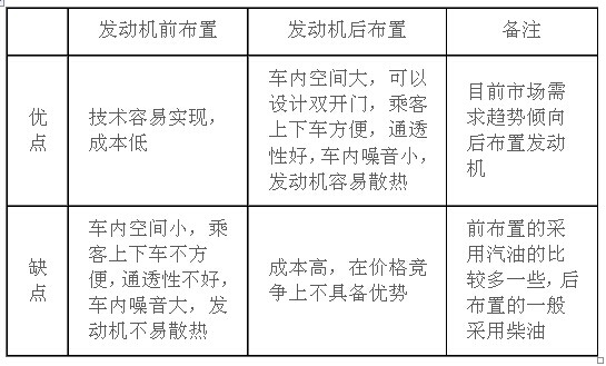 2、城乡公交车辆对发动机的布置要求。目前一般7~8米公交车发动机布置的方式有两种:有采取前布置的,也有采取后布置的。前布置与后布置各有优缺点,主要分析如下表: