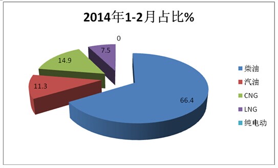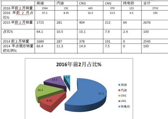 1、在2016年前2月5-8米城乡公交市场中,柴油占据了57.2%的市场份额,仍然是城乡公交中燃料动力的主体部分,但同比下降了近6.9个百分点。