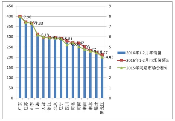 1、2016年1-2月团体车销量在全国重点前15名的销量占有的市场集中度为87.2%(比2015年1-2月的85.9%的集中度提高了近1.3个百分点),全国其他区域市场只有12.8%的市场机遇,说明团体车市场在全国的销售分部是不平衡的。