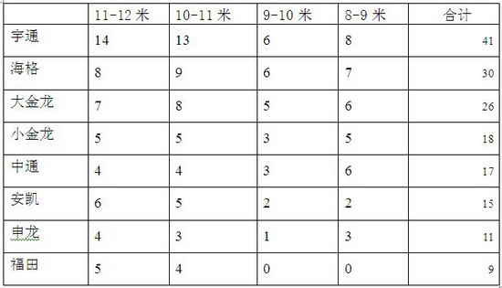 从上表可以看出,2016年1-2月宇通客车参与销售的团体车型达到41个,无论是哪个长度段,宇通参与的销售车型数量都是最多,其次是海格客车达到30个,再次是大金龙达到26个,因此可以说宇通的竞争车型最多,竞争力也最强。