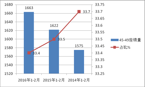 2)2014年1-2月-2016年 1-2月,45-49座的销量及占比均出现连续下降的现象