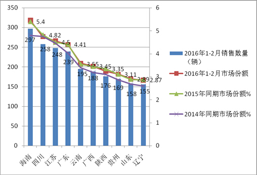 1、2016年 1-2月在全国销量位于前10名旅游客车市场的海南、四川、江苏、广东、云南、广西、陕西、贵州、山东、辽宁等10个区域市场中,共销售了2083辆旅游客车,占据了38.33%的市场份额,与2015年同期基本持平。这说明旅游客车市场不可能象高档客车那样集中度那么高,相反,旅游客车市场的集中度不高说明全国的各个市场对旅游客车来说都有机会,这也进一步证明了旅游客车产品为什么每个客车厂家都有销售,每个区域市场都能看到旅游客车在运营的主要原因了。市场集中度都高于或低于2015年同期,说明重点区域市场旅游客车市场占有率总体并没有太大变化,旅游客车销量向重点区域倾斜的力度也不明显。