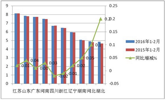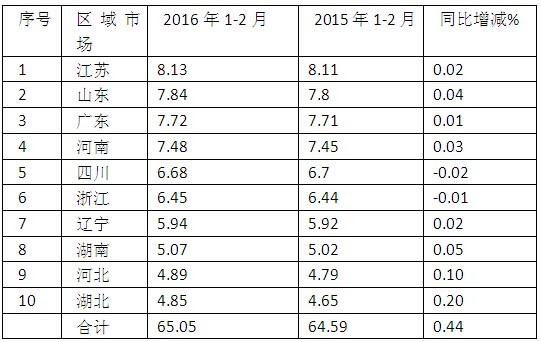 2、销量前10名主流区域市场的中档客车市场份额总和为65.05%,比2015年同期的64.59%增加了0.44个百分点,由此可以判断,2016前两个月中高档客车市场流向重点区域市场的趋势在加强,反过来说,全国其他20多个区域市场的中档客车的市场集中度必然呈现减弱趋势。