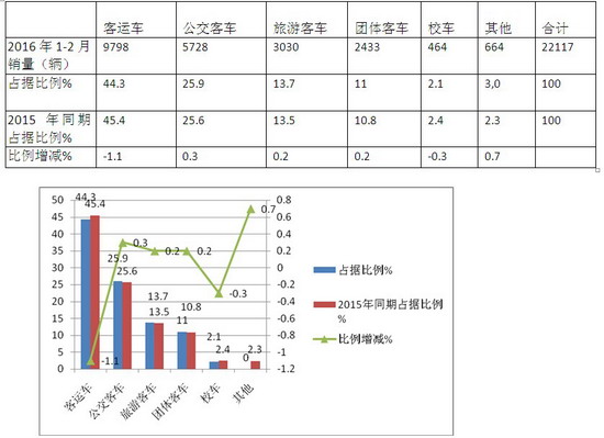 按用途划分2016年1-2月与去年同期比中档客车在各细分市场的销量结构统计表