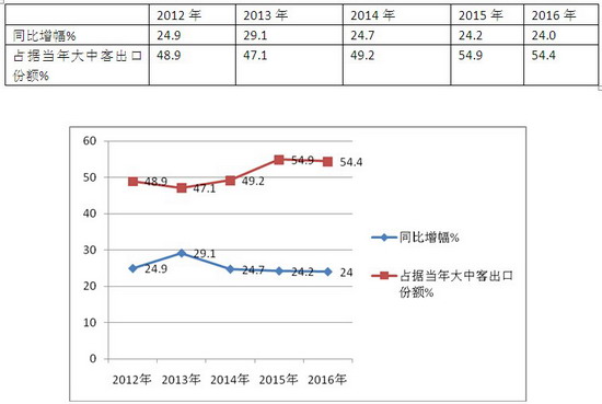根据统计,在2016年1-2月的出口的客车中,价格在30万-90万的中高档客车占据了近54.4%的市场份额,为近5年同期最大,而增幅达到近24.0%,为次小,说明30万-90万客车是2016年前2月我国大中客车市场出口的中坚力量