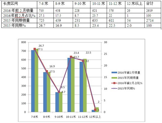 从上图表可以看出: 2016年前2月江苏市场,7-8米是主打产品,销售710辆,占整个长度细分市场的27.1%,其次是11-12米段, 销售576辆,占整个长度细分市场的22.0%.再次是10-11米客车, 销售621辆,占整个长度细分市场的23.7%,第四是8-9米段, 销售458辆,占整个长度细分市场17.5%,第五是9-10米段, 销售228辆,占整个长度细分市场的8.7%.销量最小的是12米以上的特大型客车段,销售为26辆,占据的比例为1.0%,比例最小。