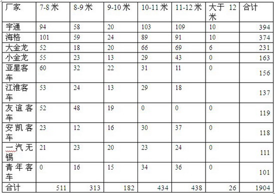 4)在大于12米的这个特殊的市场中,由于在江苏市场一共才销售26辆,前10家企业中实际上也就是宇通和二龙(不含小金龙)发生了销售,其他企业均没有发生实际销售,不能说明任何问题.一方面,笔者认为特大型客车市场在江苏这个经济发达的区域目前仍然不是主流市场,后10个月后,可能有所改变,但也不可能有太大的突破.其他企业也没有必要在这个细分市场中下功夫,因为投入和产出可能不成比例,因此风险比较大.