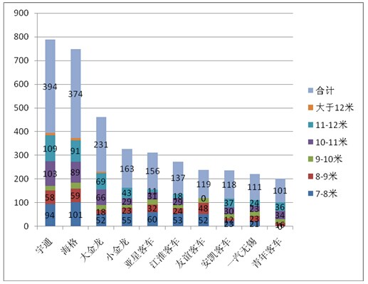3、7-8米和11-12米段是江苏市场中需求较大的两个长度段产品,需求最小的是特大型客车,9-10米车型是市场竞争最不充分的额长度区间,8-9米是竞争最为分散的细分区域,进入的难度相对最小。