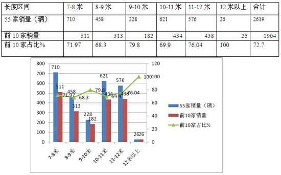 3)前10家企业在9-10米长度段占的集中度次高,达到79.9%,说明其他企业在这个细分市场只有20%左右的机会,进入的难度最大.