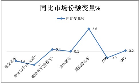 3、 下降最大的是座位客车,上升最大的是新能源客车。可见高铁和动车的市场挤压使得传统的座位客车市场受到了一定程度的而影响,而新能源LNG清洁能源公交客车和旅游客车(含校车)则是受益者。同时,LNG客车比例在上升,而CNG客车比例在下降,虽然幅度都不是很大,但LNG客车上升幅度大于CNG下降幅度,可以看出NG类客车的转换趋势。