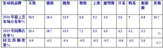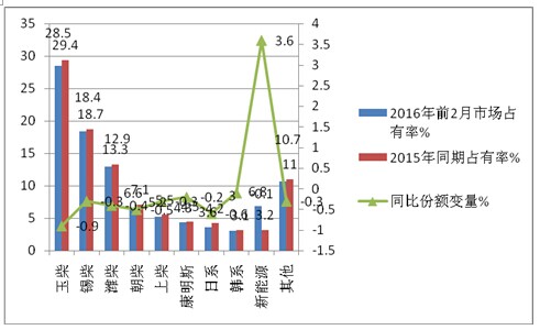 根据上牌数据信息,2016年前2月江苏区域大中客销量中按动力品牌划分市场份额同比表%