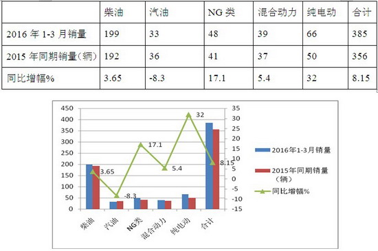 根据市场调研,2016年1-3月累计销售MPB客车385辆,同比增长8.15%,按发动机种类划分,销量结构如下: