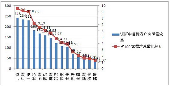 本次共计调研的100家目标市场,2016年一季度对6-8米电动车的实际需求量为2555辆,需求量位居前15名的区域如下表: