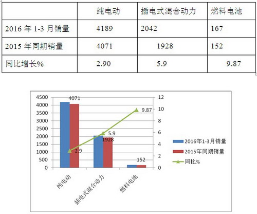 根据最新上牌信息,2016年1-3月6米(含)及以上纯电动客车销售4189辆,同比2015年1-3月的4071增长2.90%,插电式混合动力客车销售2042辆,同比(2015年1-3月销售1928辆增长5.9%,燃料电池客车销售167辆,同比(2015年1-3月销售152辆)增长9.87%。