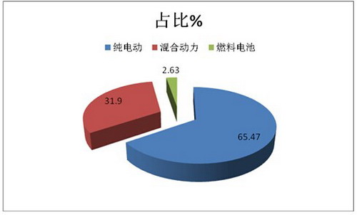 从上图表看出,在2016年1-3月的新能源客车销量中,纯电动客车销量占据了绝对的比例,达到65.47%,混合动力客车只有31.9%,燃料电池客车比例只有2.63%,三者比例数值相差较大。